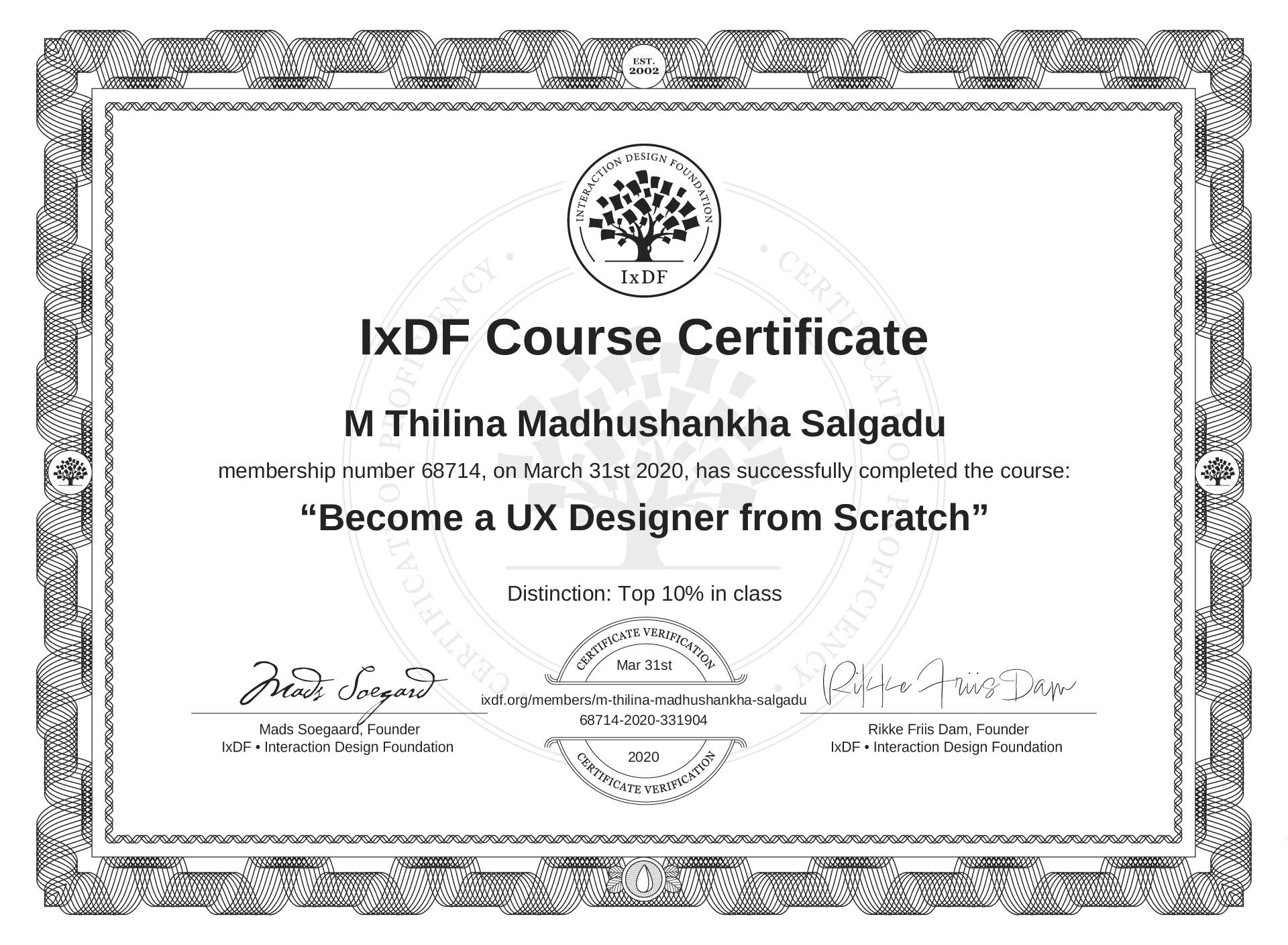 The IxDF Course Certificate above is awarded to M Thilina Madhushankha Salgadu with a Top 10% Distinction in formal recognition of their coursework surpassing the rigorous benchmarks of exceptional performance established by the IxDF Educational Codex.