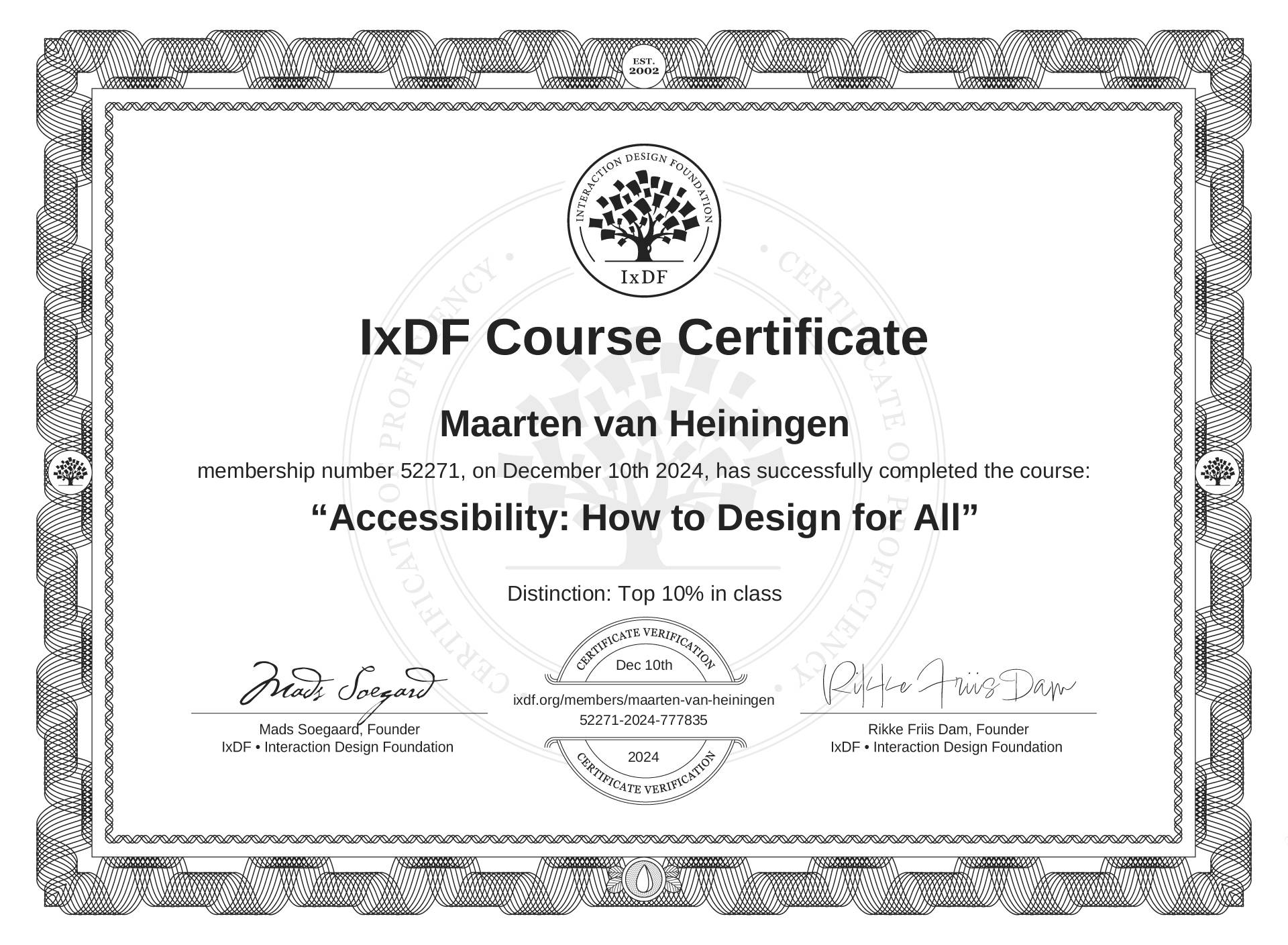 The IxDF Course Certificate above is awarded to Maarten van Heiningen with a Top 10% Distinction in formal recognition of their coursework surpassing the rigorous benchmarks of exceptional performance established by the IxDF Educational Codex.