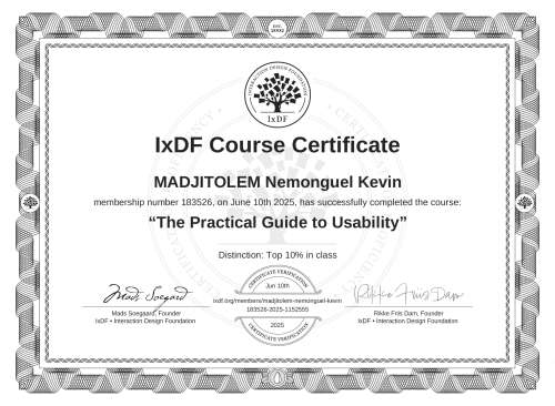 IxDF Course Certificates are awarded to MADJITOLEM Némonguel Kévin in formal recognition of their coursework surpassing the rigorous benchmarks of exceptional performance established by the IxDF Educational Codex.