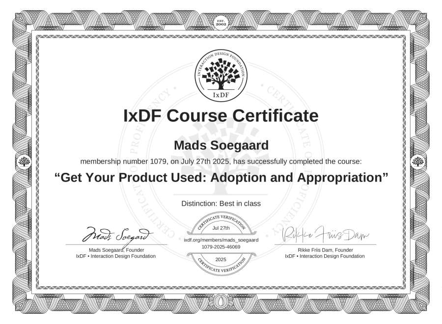 Mads Soegaard's IxDF Course Certificate: Get Your Product Used: Adoption and Appropriation