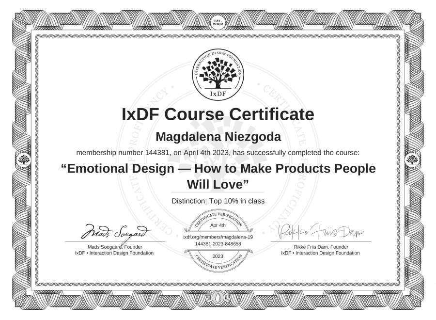 Magdalena Niezgoda's IxDF Course Certificate: Emotional Design — How to Make Products People Will Love