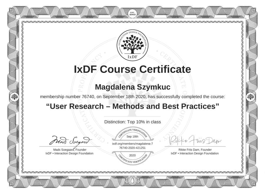 Magdalena Szymkuć's IxDF Course Certificate: User Research – Methods and Best Practices