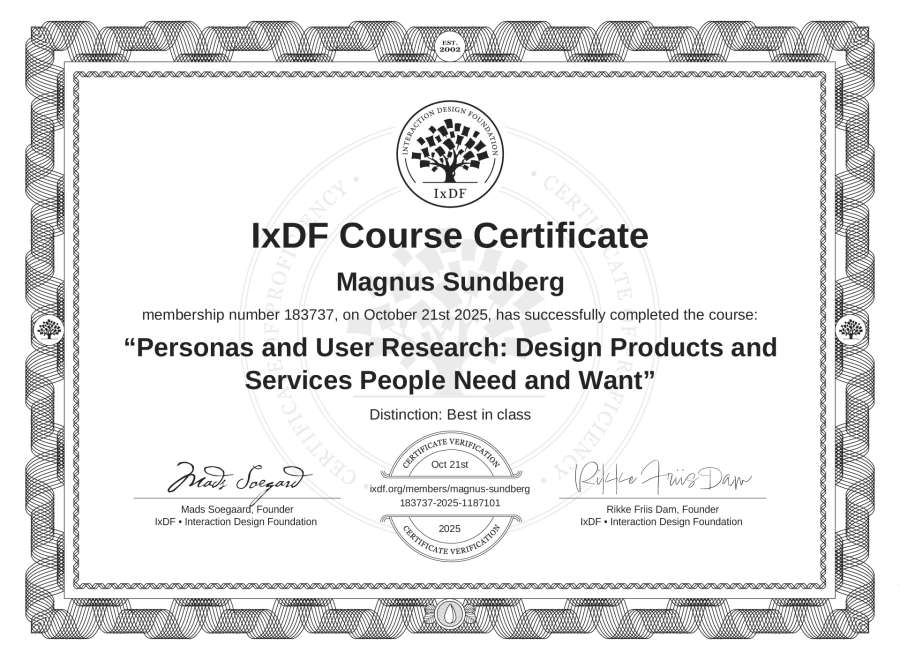 Magnus Sundberg's IxDF Course Certificate: Personas and User Research: Design Products and Services People Need and Want