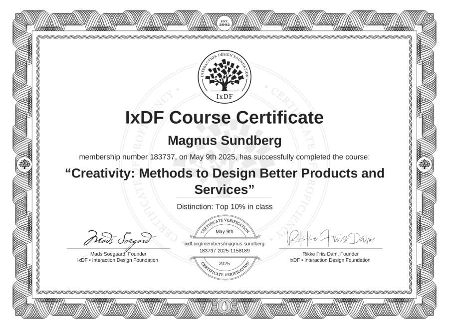 The IxDF Course Certificate above is awarded to Magnus Sundberg with a Top 10% Distinction in formal recognition of their coursework surpassing the rigorous benchmarks of exceptional performance established by the IxDF Educational Codex.