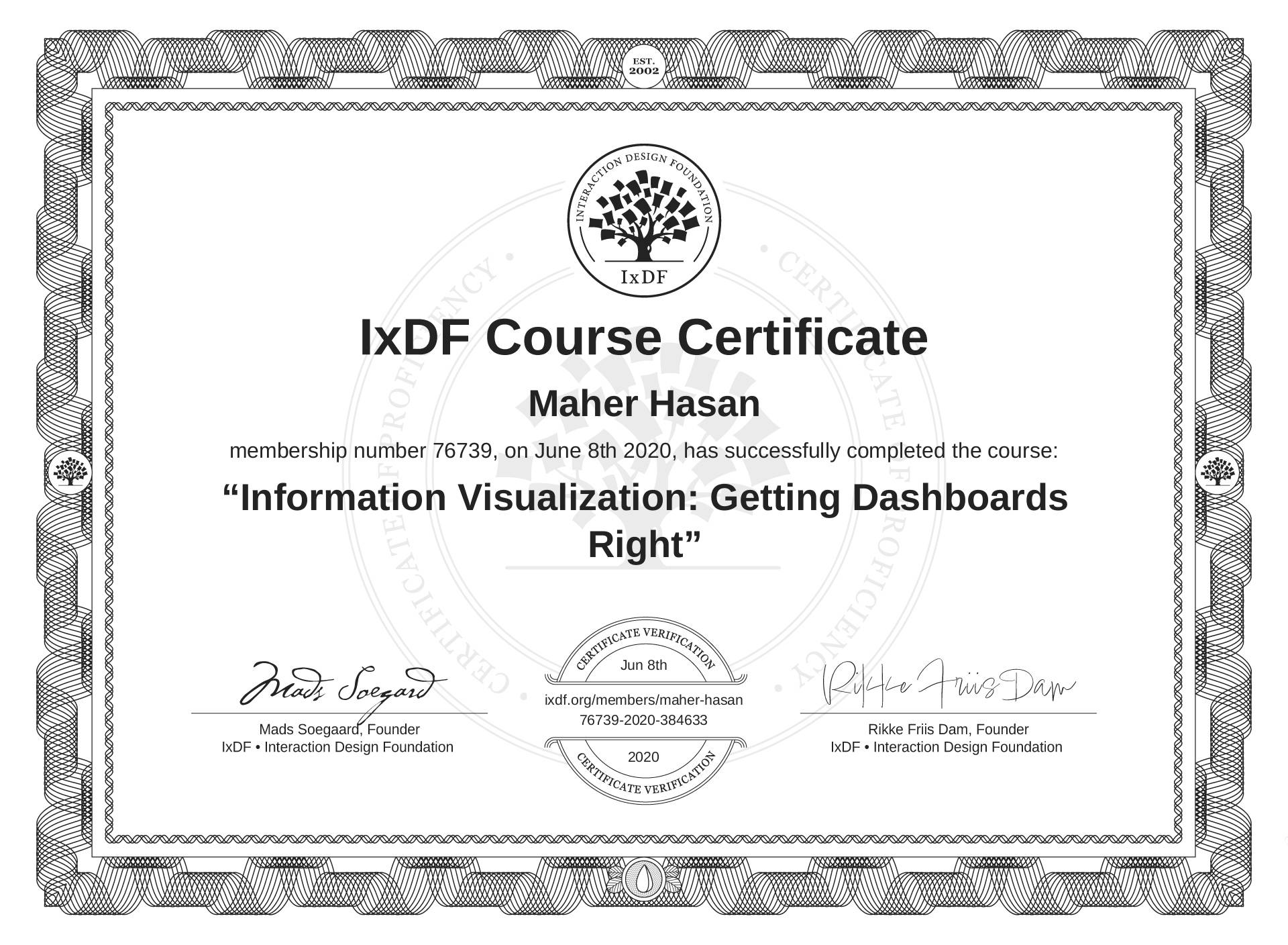 Maher Hasan's IxDF Course Certificate: Information Visualization: Getting Dashboards Right