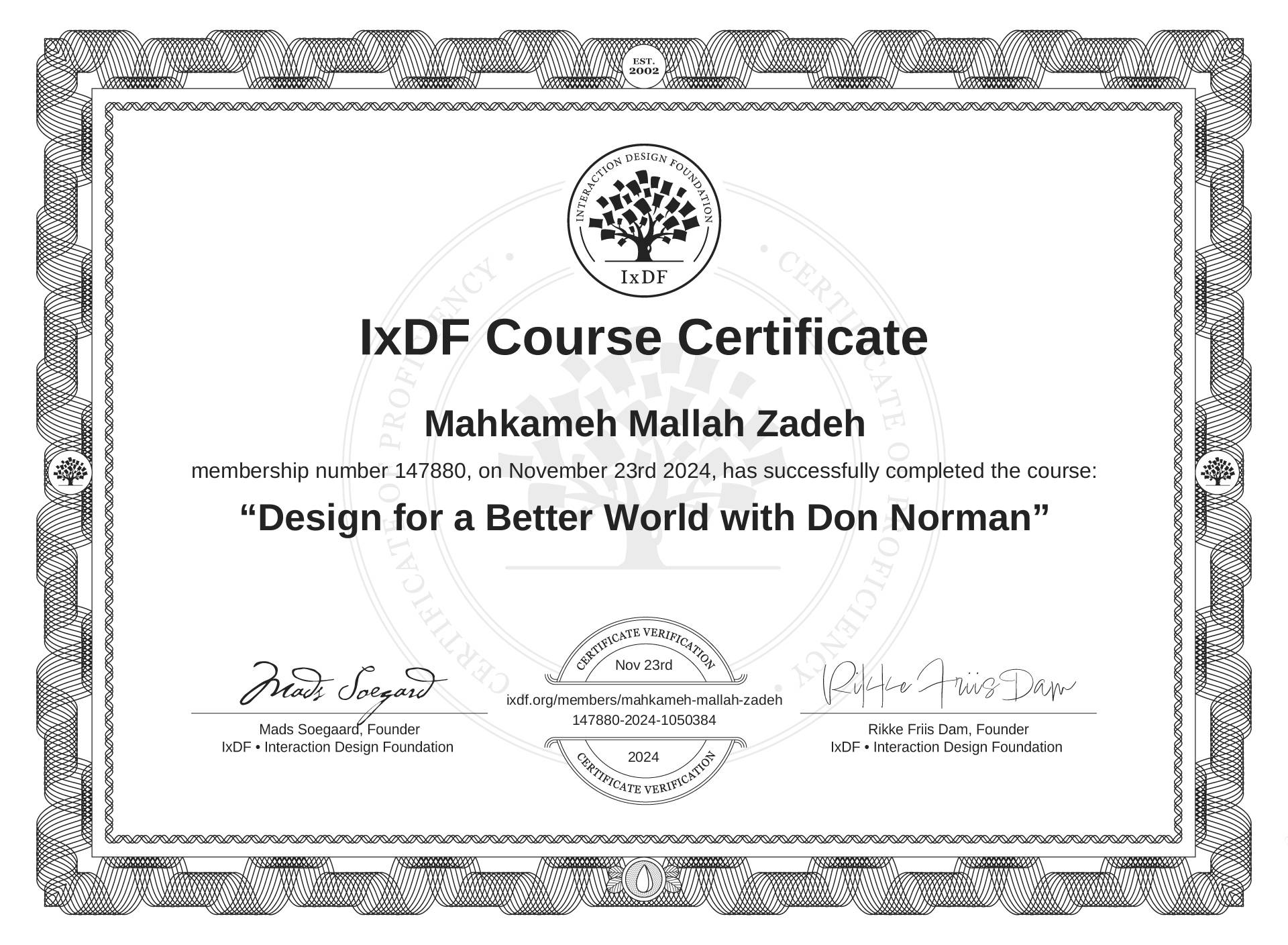 Mahkameh Mallah Zadeh's IxDF Course Certificate: Design for a Better World with Don Norman