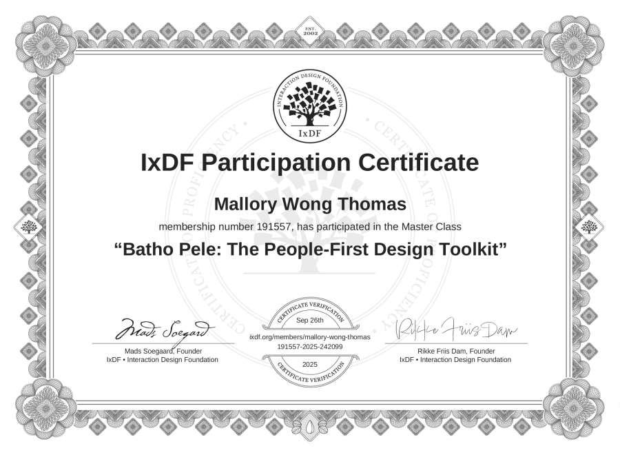 Mallory Wong Thomas's IxDF Masterclass Certificate: Batho Pele: The People-First Design Toolkit