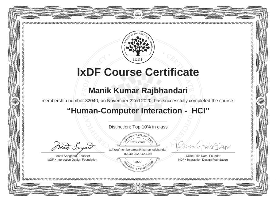 Manik Kumar Rajbhandari's IxDF Course Certificate: Human-Computer Interaction - HCI