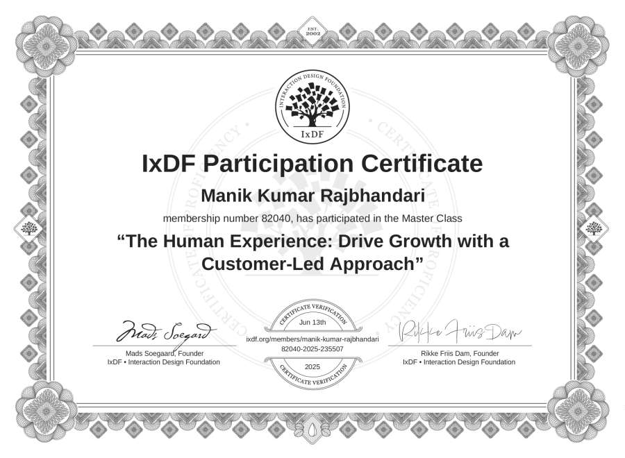 Manik Kumar Rajbhandari's IxDF Masterclass Certificate: The Human Experience: Drive Growth with a Customer-Led Approach