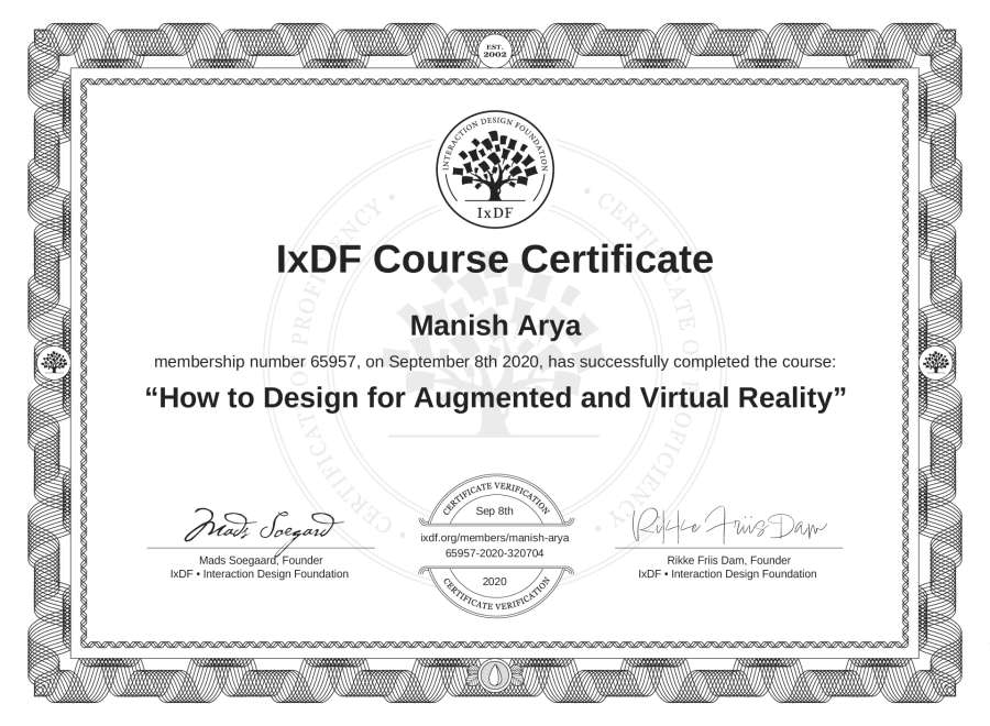Manish Arya's IxDF Course Certificate: How to Design for Augmented and Virtual Reality