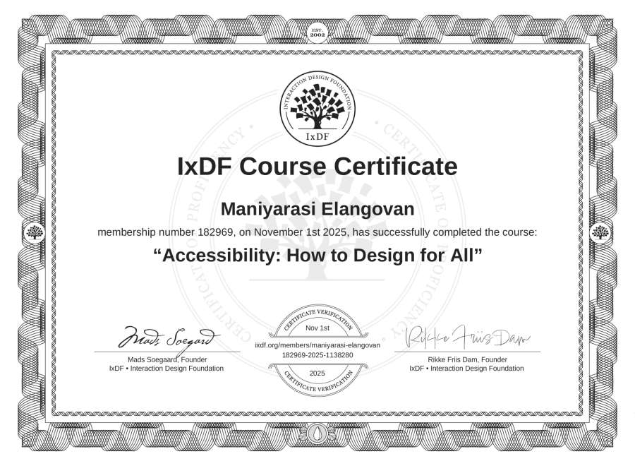 Maniyarasi Elangovan's IxDF Course Certificate: Accessibility: How to Design for All