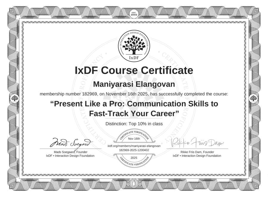The IxDF Course Certificate above is awarded to Maniyarasi Elangovan with a Top 10% Distinction in formal recognition of their coursework surpassing the rigorous benchmarks of exceptional performance established by the IxDF Educational Codex.