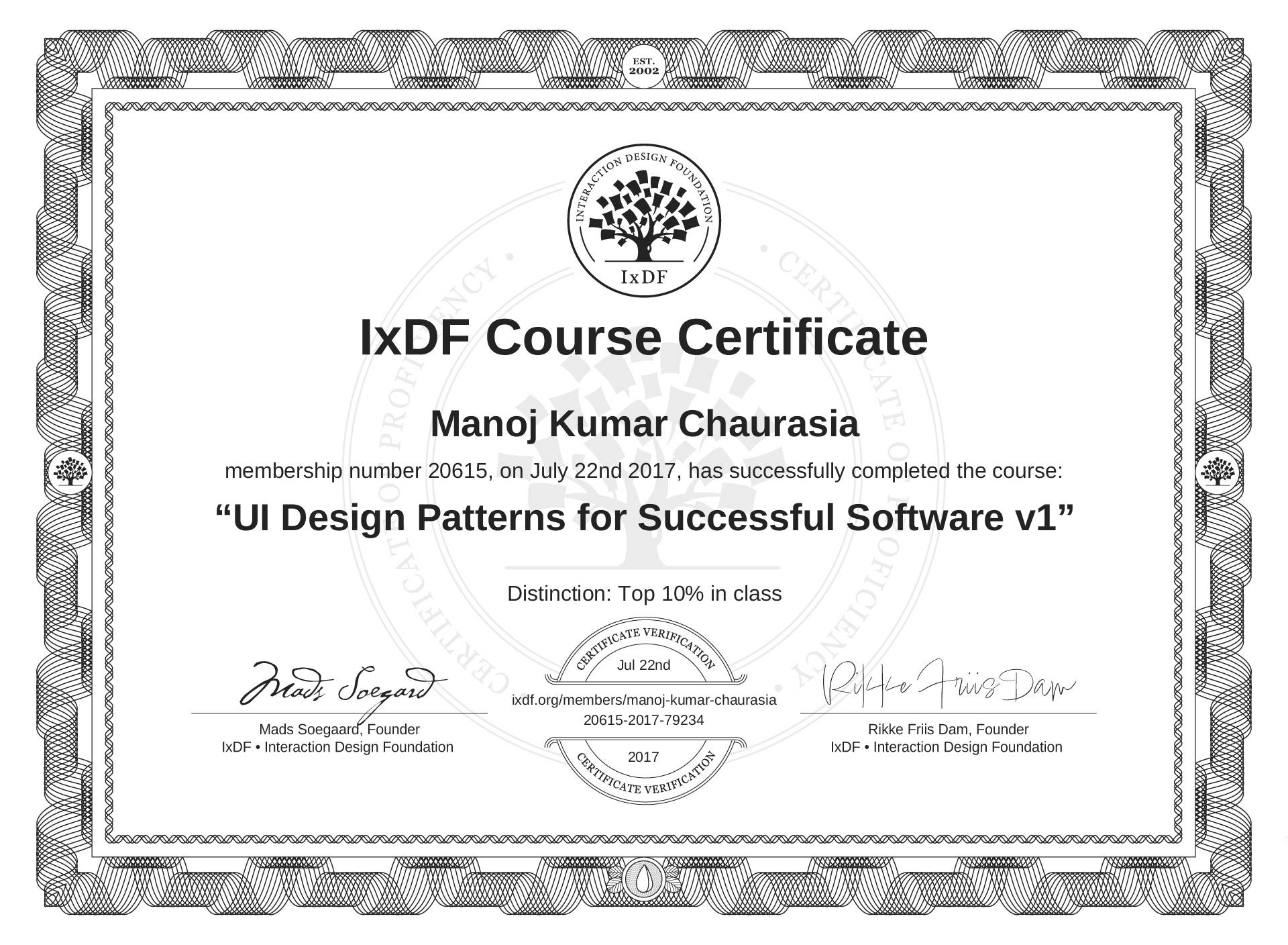Manoj Kumar Chaurasia's IxDF Course Certificate: UI Design Patterns for Successful Software v1