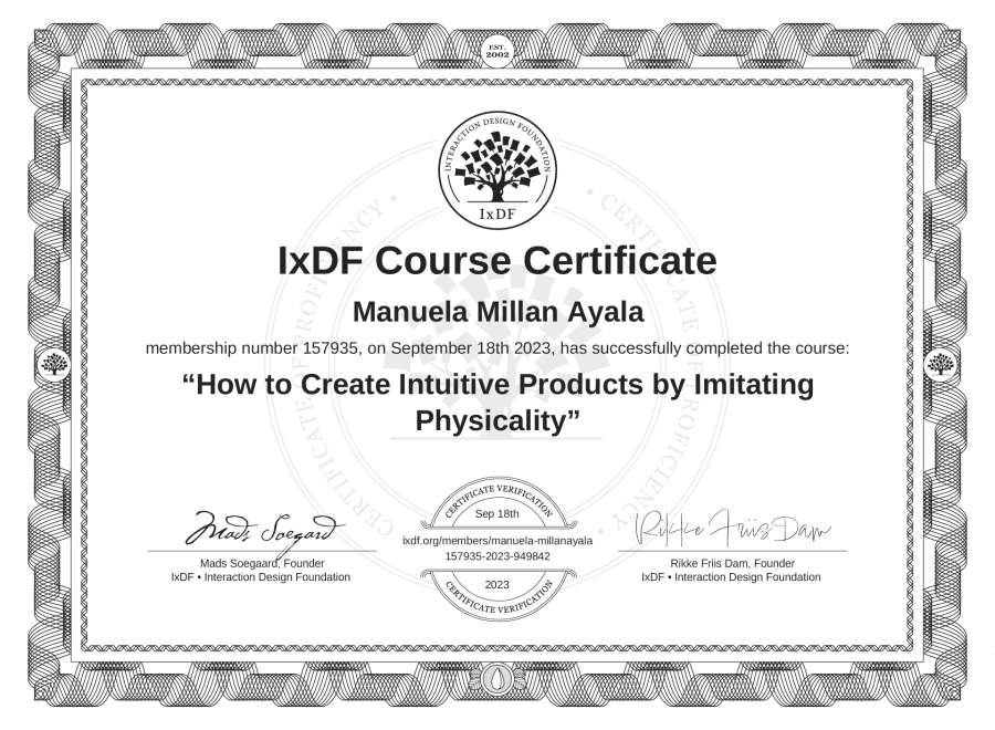 Manuela Millan Ayala's IxDF Course Certificate: How to Create Intuitive Products by Imitating Physicality