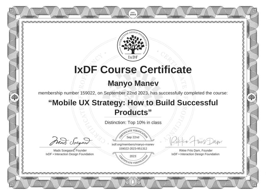 The IxDF Course Certificate above is awarded to Manyo Manev with a Top 10% Distinction in formal recognition of their coursework surpassing the rigorous benchmarks of exceptional performance established by the IxDF Educational Codex.