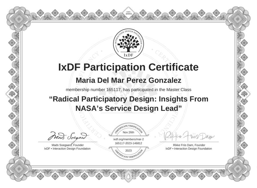 María Del Mar Pérez González's IxDF Masterclass Certificate: Radical Participatory Design: Insights From NASA’s Service Design Lead