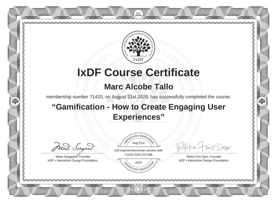 Marc Alcobé Talló's IxDF Course Certificate: Gamification - How to Create Engaging User Experiences
