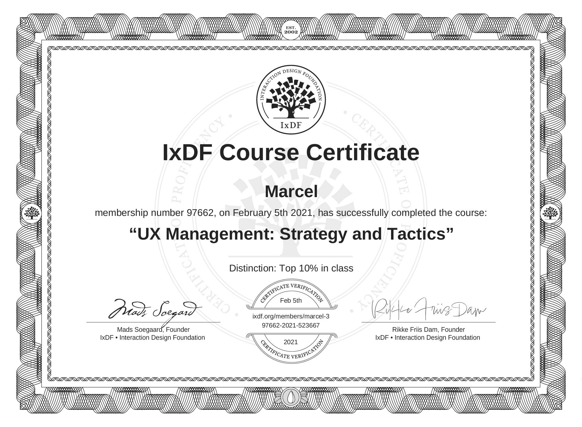 The IxDF Course Certificate above is awarded to Marcel with a Top 10% Distinction in formal recognition of their coursework surpassing the rigorous benchmarks of exceptional performance established by the IxDF Educational Codex.