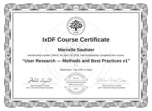 IxDF Course Certificates are awarded to Marcelle Saulnier in formal recognition of their coursework surpassing the rigorous benchmarks of exceptional performance established by the IxDF Educational Codex.