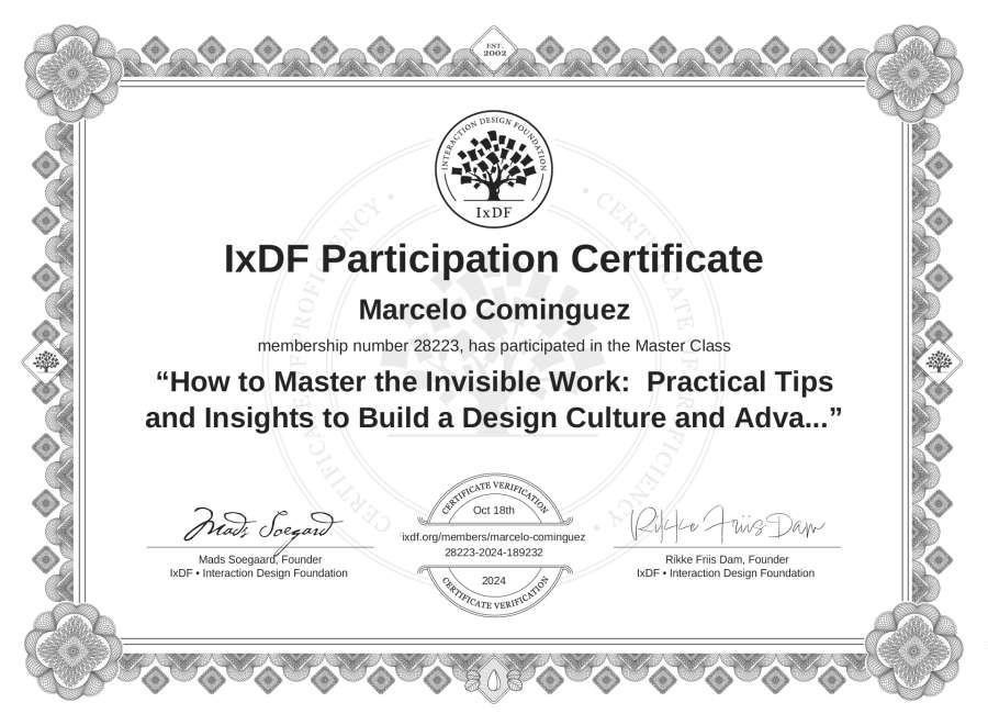 Marcelo Cominguez's IxDF Masterclass Certificate: How to Master the Invisible Work: Practical Tips and Insights to Build a Design Culture and Advance Your Career