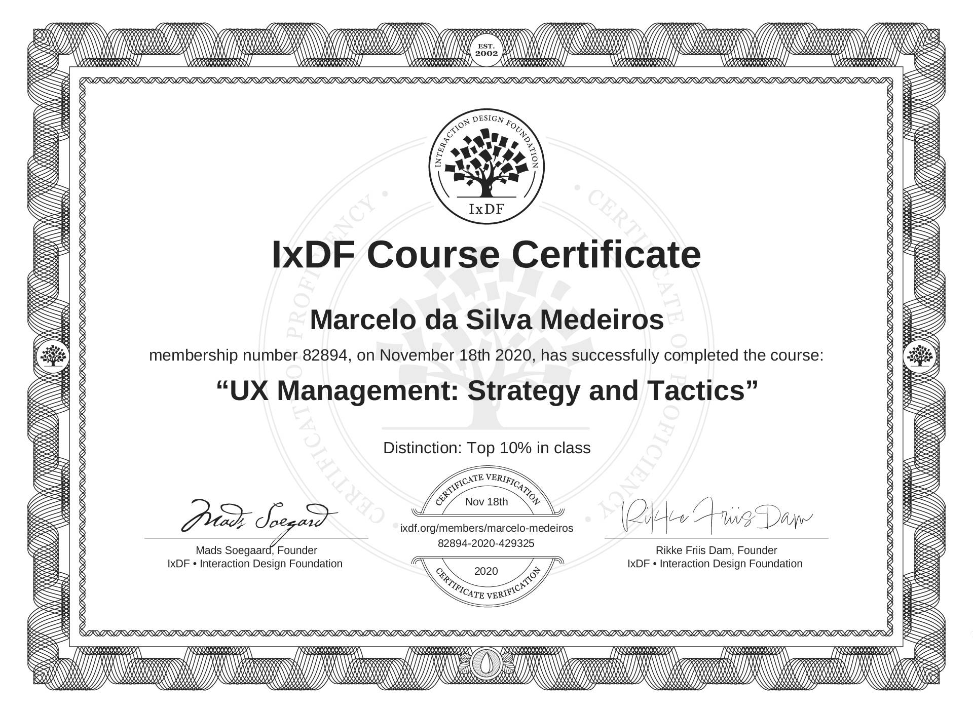 The IxDF Course Certificate above is awarded to Marcelo da Silva Medeiros with a Top 10% Distinction in formal recognition of their coursework surpassing the rigorous benchmarks of exceptional performance established by the IxDF Educational Codex.