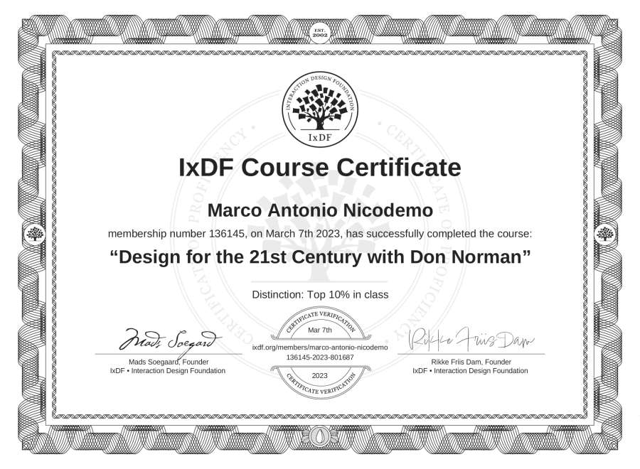 Marco Antonio Nicodemo's IxDF Course Certificate: Design for the 21st Century with Don Norman