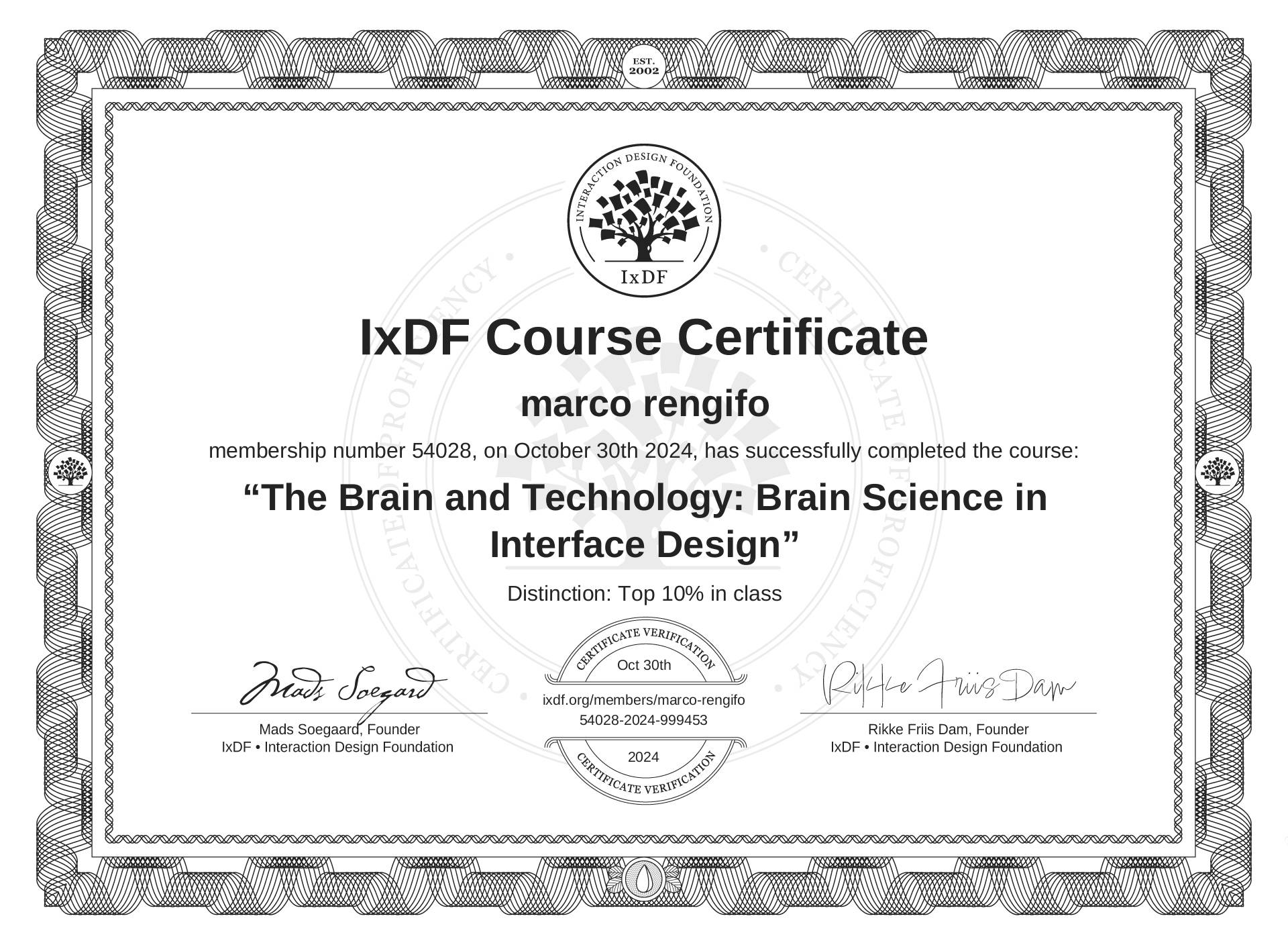 The IxDF Course Certificate above is awarded to marco rengifo with a Top 10% Distinction in formal recognition of their coursework surpassing the rigorous benchmarks of exceptional performance established by the IxDF Educational Codex.