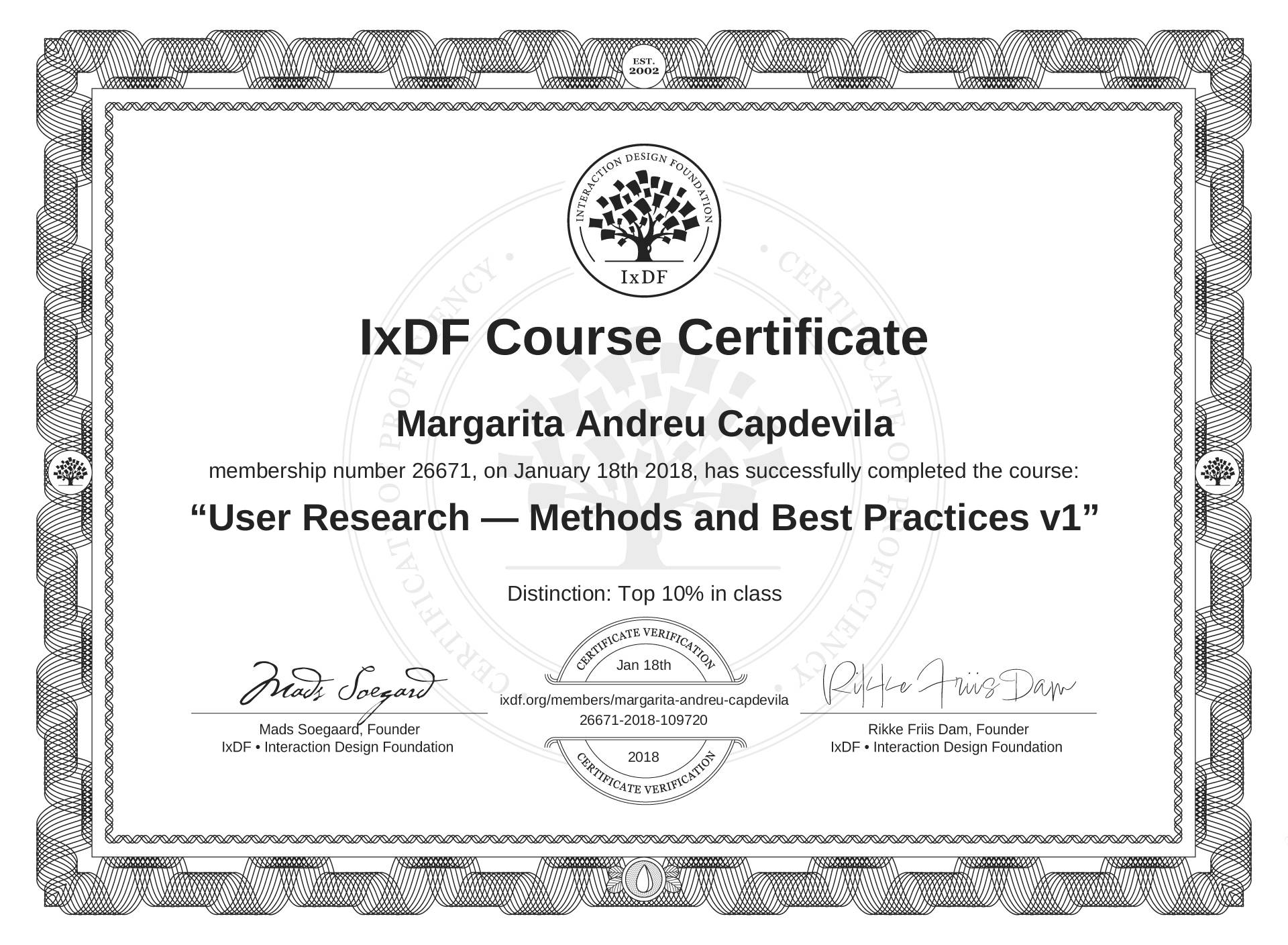The IxDF Course Certificate above is awarded to Margarita Andréu Capdevila with a Top 10% Distinction in formal recognition of their coursework surpassing the rigorous benchmarks of exceptional performance established by the IxDF Educational Codex.