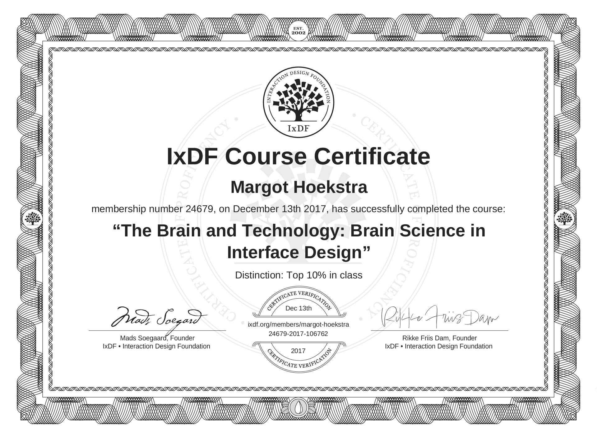 Margot Hoekstra's IxDF Course Certificate: The Brain and Technology: Brain Science in Interface Design