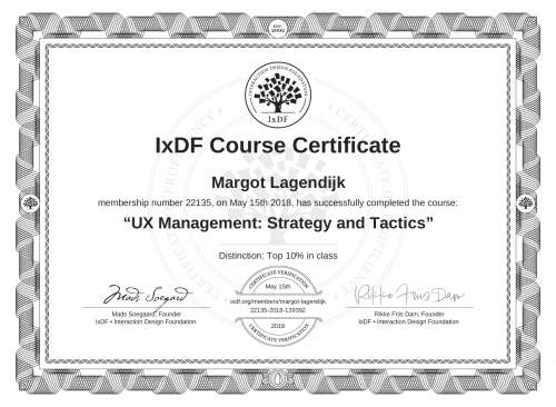 IxDF Course Certificates are awarded to Margot Lagendijk in formal recognition of their coursework surpassing the rigorous benchmarks of exceptional performance established by the IxDF Educational Codex.