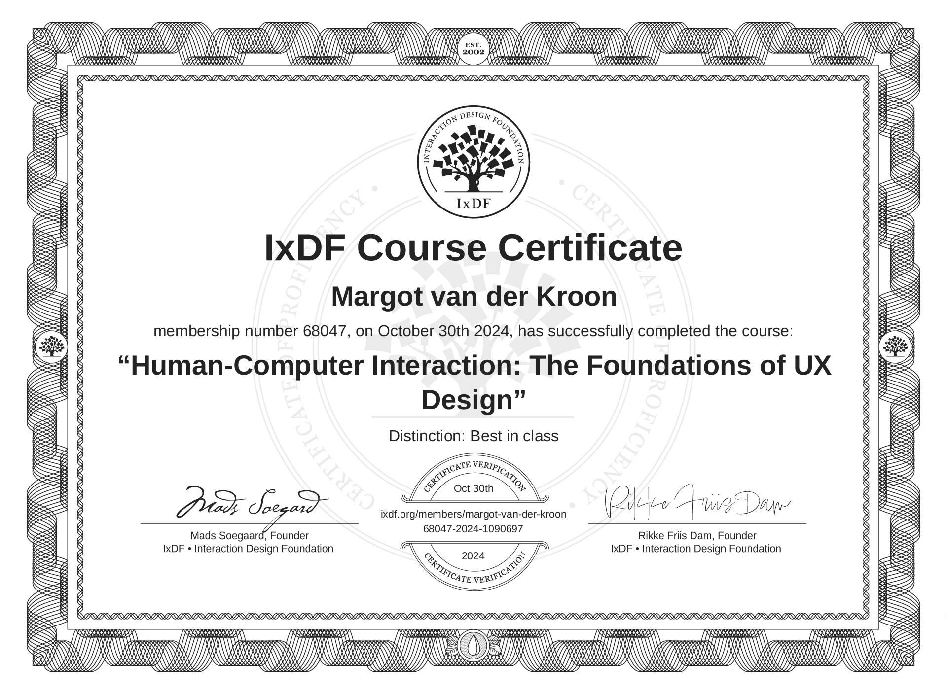 The IxDF Course Certificate above is awarded to Margot van der Kroon with a Best in Class Distinction in formal recognition of their coursework surpassing the rigorous benchmarks of exceptional performance established by the IxDF Educational Codex.