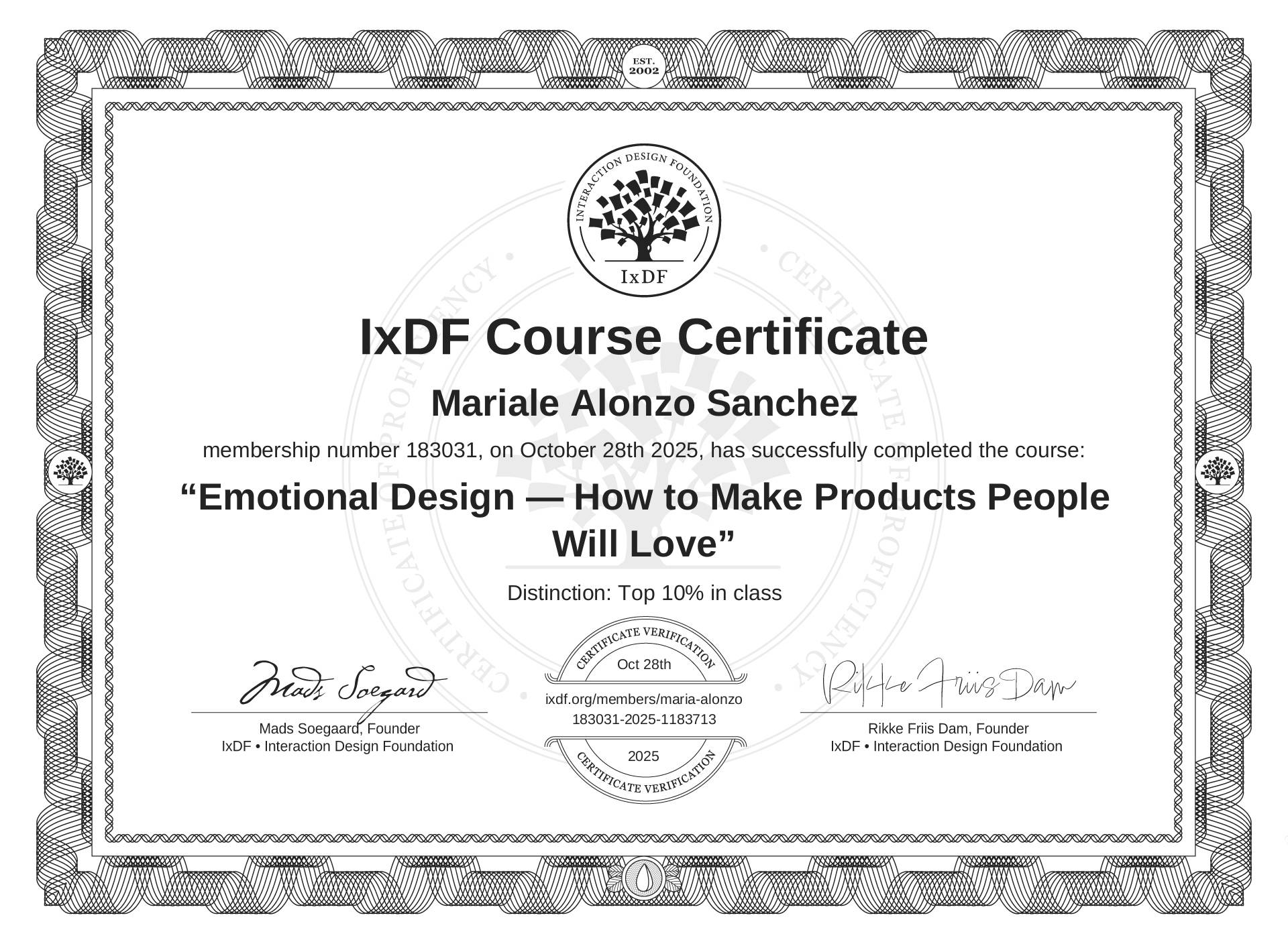 Mariale Alonzo Sánchez's IxDF Course Certificate: Emotional Design — How to Make Products People Will Love