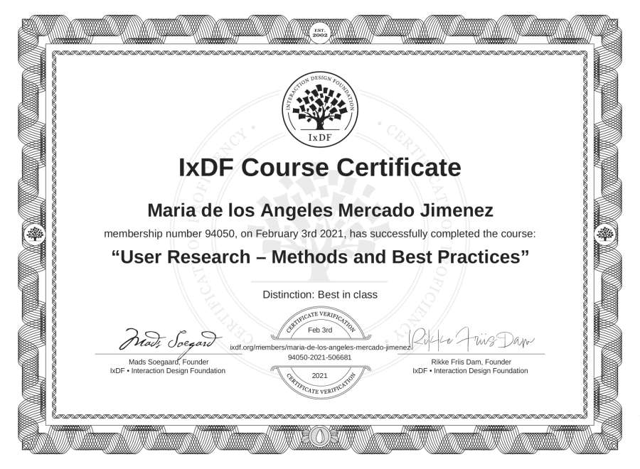María de los Angeles Mercado Jimenez's IxDF Course Certificate: User Research – Methods and Best Practices