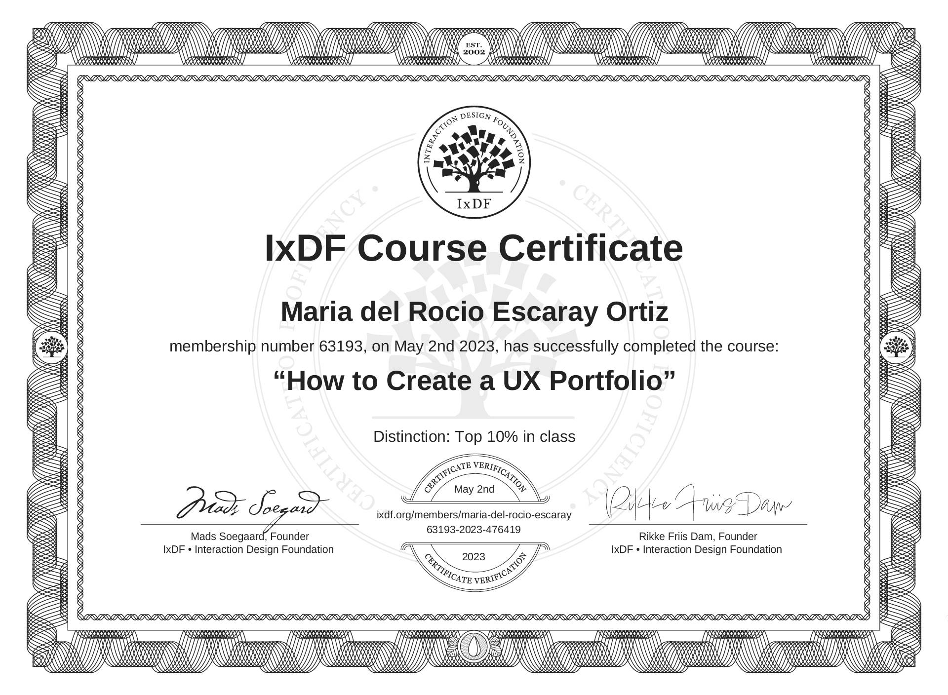 The IxDF Course Certificate above is awarded to Maria del Rocio Escaray Ortiz with a Top 10% Distinction in formal recognition of their coursework surpassing the rigorous benchmarks of exceptional performance established by the IxDF Educational Codex.