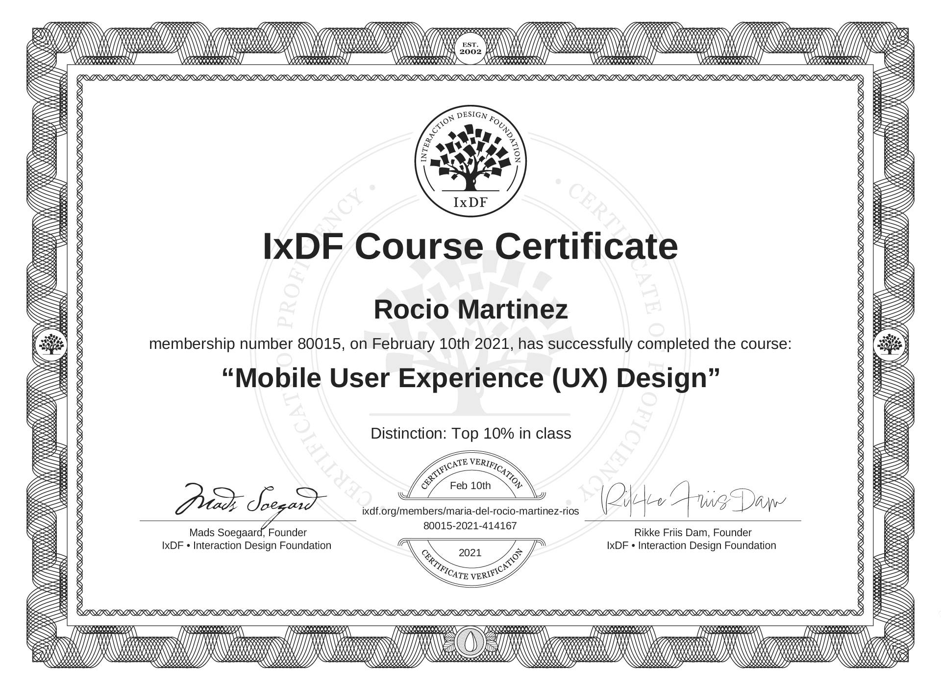 The IxDF Course Certificate above is awarded to Rocio Martinez with a Top 10% Distinction in formal recognition of their coursework surpassing the rigorous benchmarks of exceptional performance established by the IxDF Educational Codex.