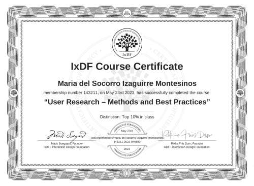 IxDF Course Certificates are awarded to María del Socorro Izaguirre Montesinos in formal recognition of their coursework surpassing the rigorous benchmarks of exceptional performance established by the IxDF Educational Codex.