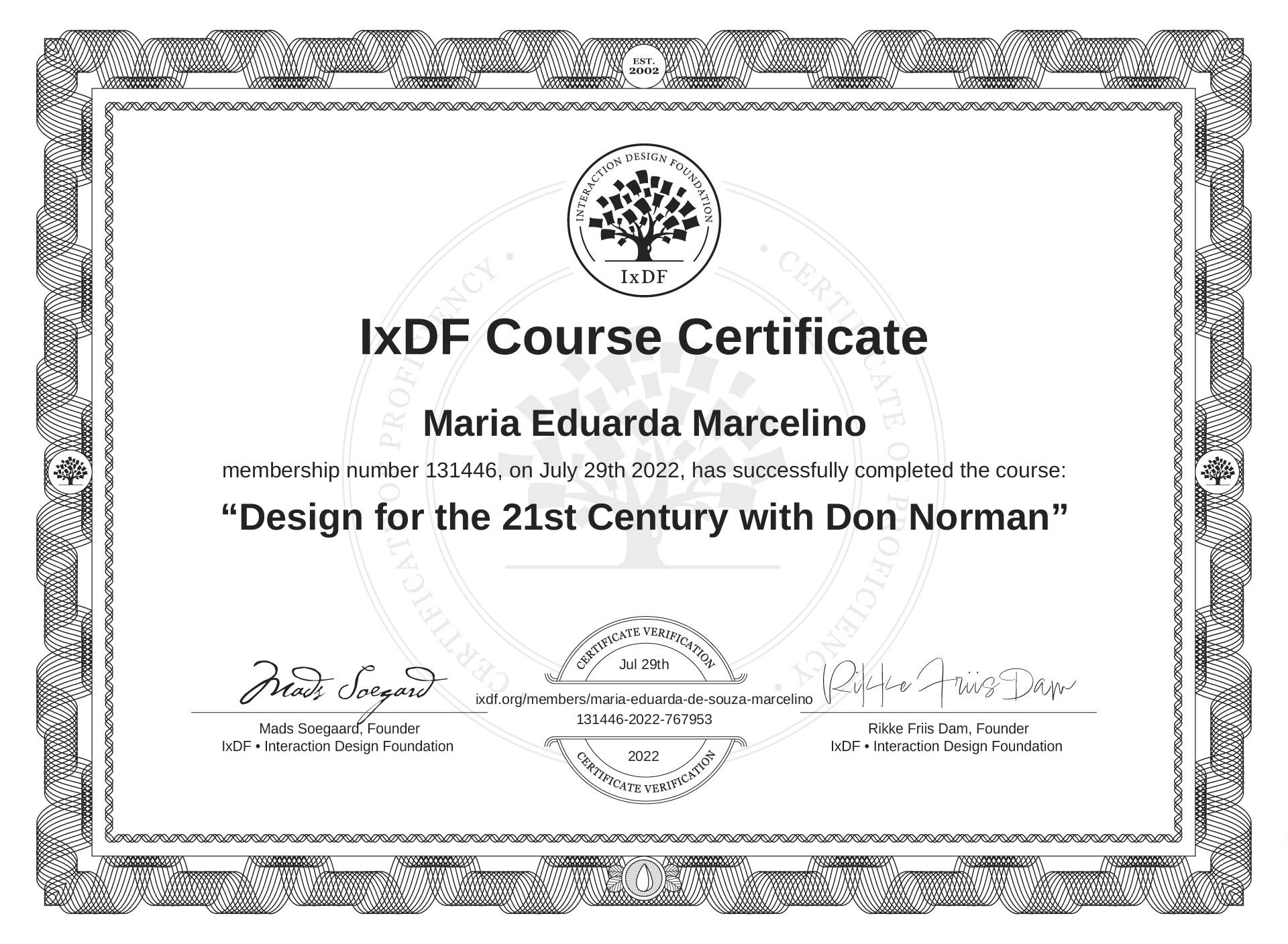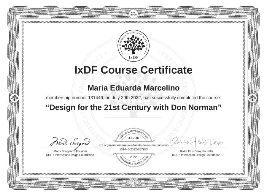 Maria Eduarda Marcelino's IxDF Course Certificate: Design for the 21st Century with Don Norman