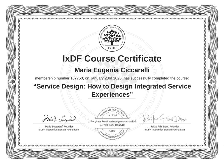 Maria Eugenia Ciccarelli's IxDF Course Certificate: Service Design: How to Design Integrated Service Experiences
