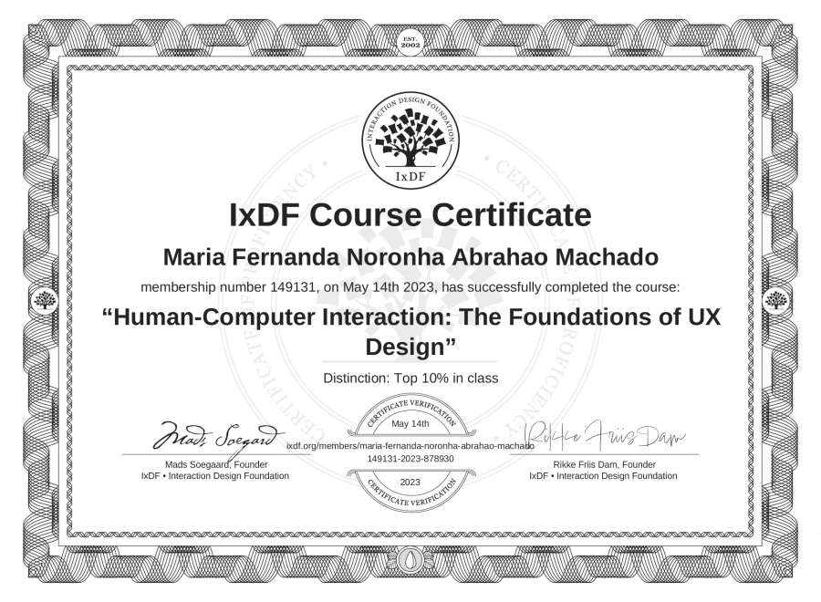 Maria Fernanda Noronha Abrahão Machado's IxDF Course Certificate: Human-Computer Interaction: The Foundations of UX Design