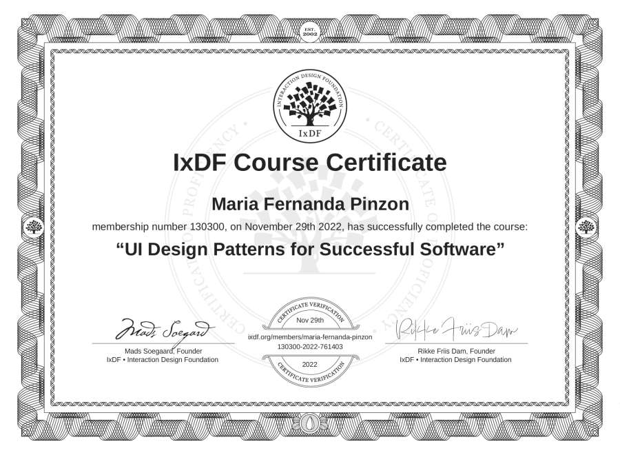 Maria Fernanda Pinzon's IxDF Course Certificate: UI Design Patterns for Successful Software