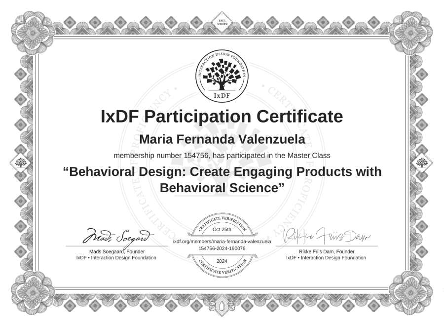 María Fernanda Valenzuela's IxDF Masterclass Certificate: Behavioral Design: Create Engaging Products with Behavioral Science