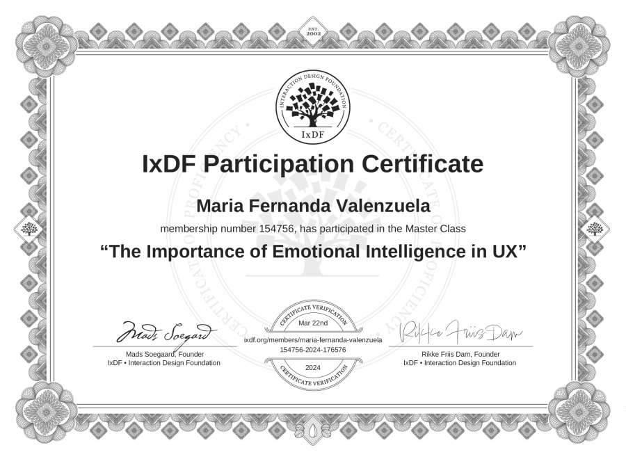 María Fernanda Valenzuela's IxDF Masterclass Certificate: The Importance of Emotional Intelligence in UX