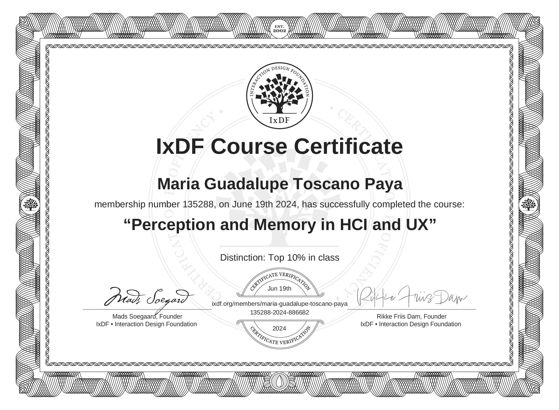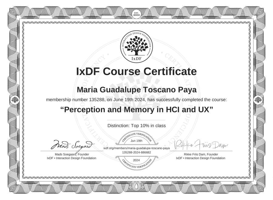 Maria Guadalupe Toscano Paya's IxDF Course Certificate: Perception and Memory in HCI and UX