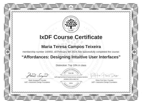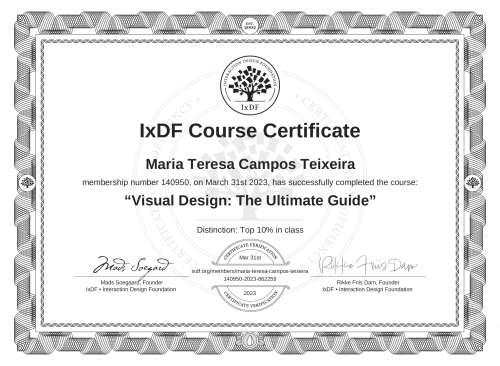 This IxDF Membership Certificate is issued to Maria Teresa Campos Teixeira in formal recognition of their membership of the IxDF, global leader in design education.