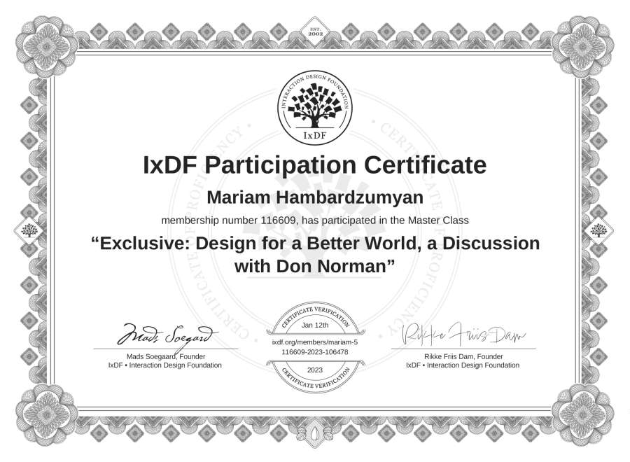 Mariam Hambardzumyan's IxDF Masterclass Certificate: Exclusive: Design for a Better World, a Discussion with Don Norman