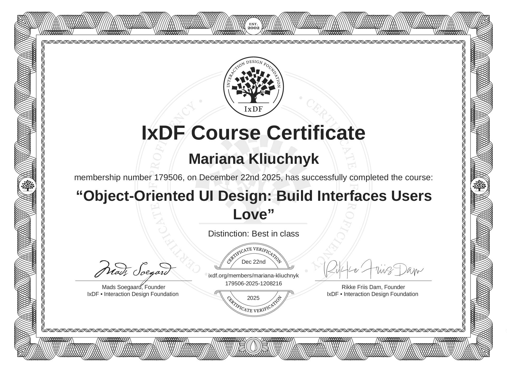 Mariana Kliuchnyk's IxDF Course Certificate: Object-Oriented UI Design: Build Interfaces Users Love