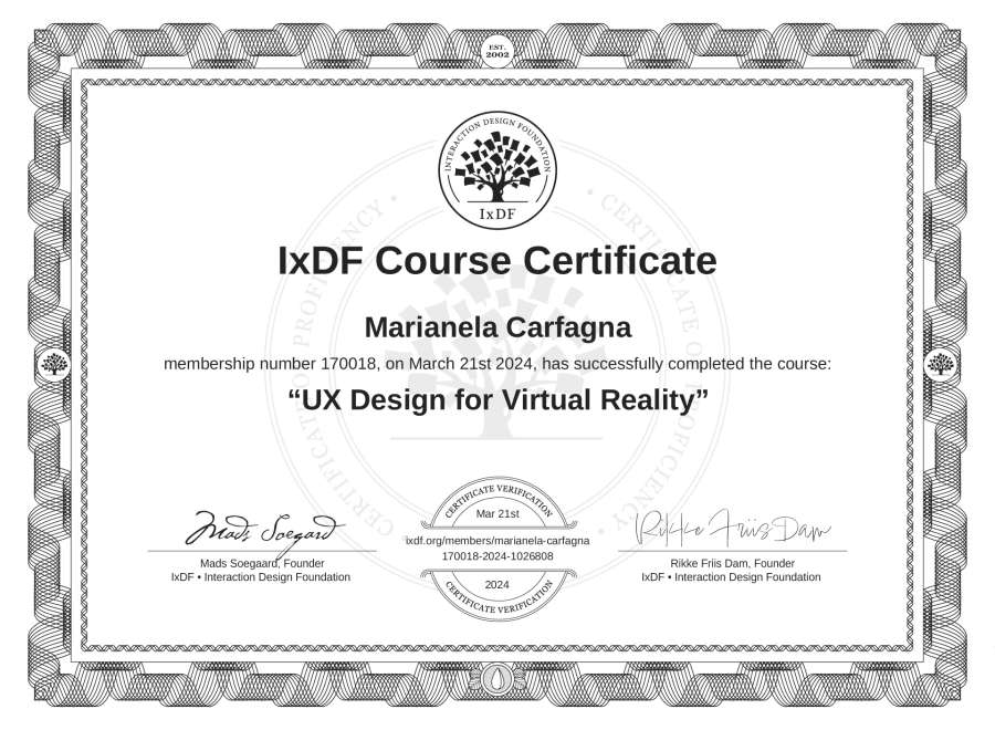 Marianela Carfagna's IxDF Course Certificate: UX Design for Virtual Reality