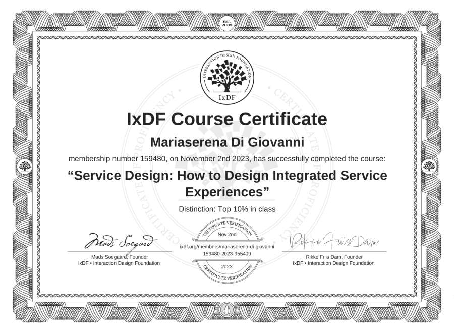 Mariaserena Di Giovanni's IxDF Course Certificate: Service Design: How to Design Integrated Service Experiences