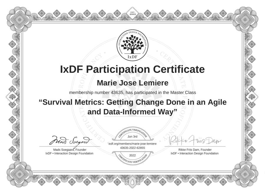 Marie Jose Lemiere's IxDF Masterclass Certificate: Survival Metrics: Getting Change Done in an Agile and Data-Informed Way