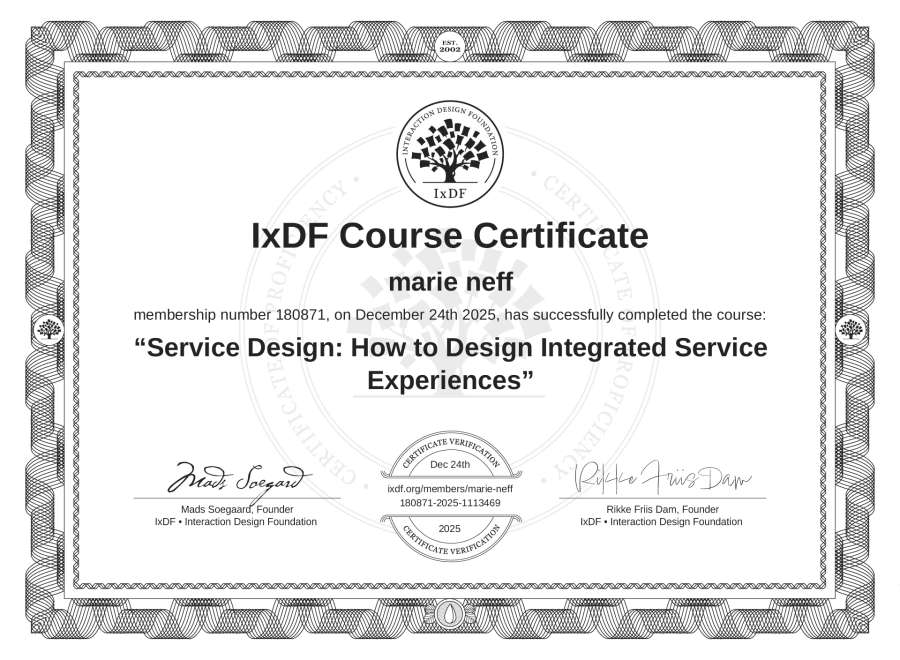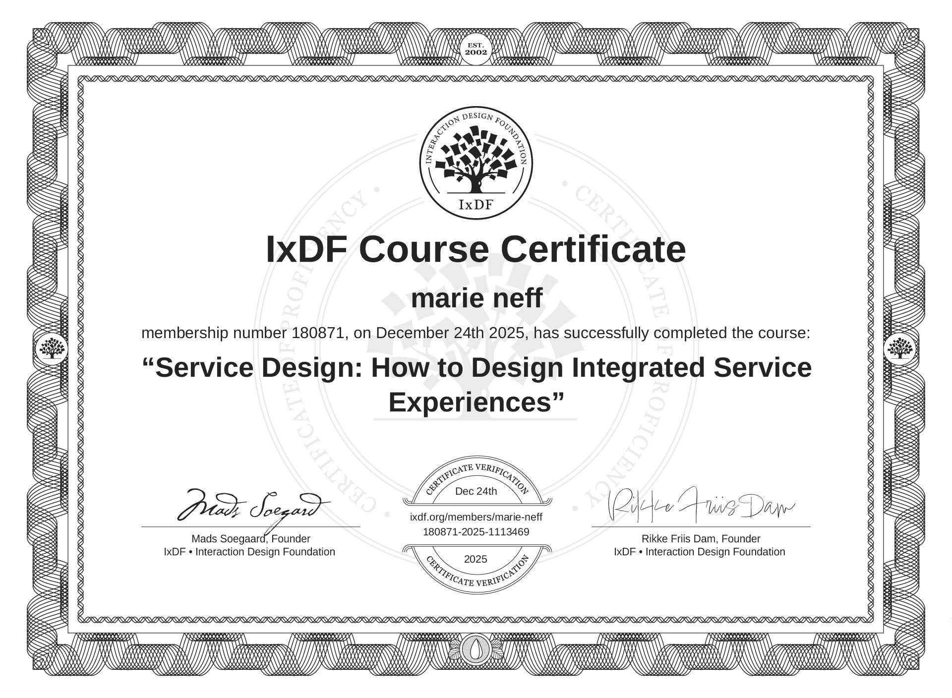 marie neff's IxDF Course Certificate: Service Design: How to Design Integrated Service Experiences